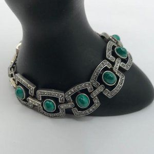 Jenavi Silver Panels Bracelet with Rhinestones and Malachite Cabachons.