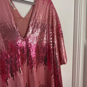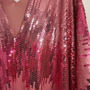 This show-stopping Stratus Pink Sequin Caftan from Jennafer Grace is a rare, limited-edition handmade piece. Covered in cascading pink and rose-toned sequins, it drapes effortlessly for a glamorous, floaty silhouette. Worn once, in excellent condition.