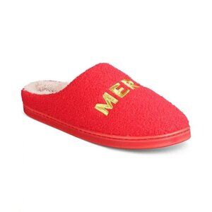 Jenni Cozy Red Merry Vibes Gold Embroidered Plush Terry Slippers-Size L- 9-10