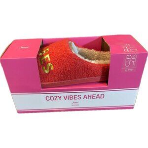 ITEM: Jenni Cozy Red Merry Vibes Gold Embroidered Plush Terry Slippers-Size L- 9-10