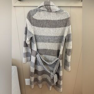 We love a sustainable color story: our Belted Sweater Coat uses natural, undyed colors, resulting in a neutral colorway that's great for your all-season wardrobe and, most importantly, the planet. Sourced directly from Tibetan herders, our yak fiber honors the time-tested and socially responsible techniques of farmers with generations of experience. 31% yak, 31% alpaca, 22% nylon, 16% merino wool. Made in China. Shawl collar, three color stripe, and a belt. This super luxe yak knit is a bit longer than our regular Sweater Coat, providing a perfectly cozy fit. Dry clean. Fits true to size.