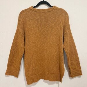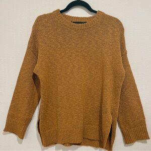 A beautiful Jenni Kayne cotton–linen blend sweater in a warm caramel/mustard tone. Classic fisherman-inspired knit with a relaxed fit, ribbed trim, and side slits. High-quality texture and the perfect neutral for fall and layering.