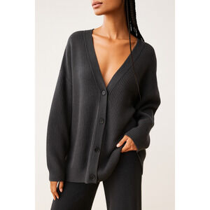 Jenni Kayne cardigan, cashmere boyfriend sweater, oversized knit cardigan, luxury loungewear, minimalist knitwear, Jenni Kayne XL, charcoal cashmere sweater, cozy knit cardigan, Jenni Kayne essential, soft ribbed sweater, women’s designer cardigan, winter fashion staple, sustainable luxury clothing, relaxed cashmere knit, neutral wardrobe basics