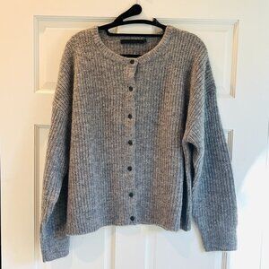 Worn once. With delicate details and a luxe fuzzy feel, this perfectly feminine knit is the extra-special piece worthy of every wardrobe. Ideal for cool weather. 35% alpaca, 35% wool, 30% polyester. Made in China. Relaxed-fit crewneck cardigan. Dry clean.