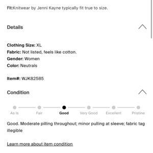 • Condition: Good – moderate pilling throughout, minor pulling at sleeve (priced accordingly)