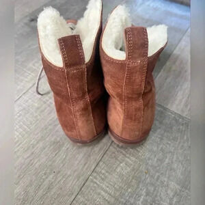 Suede upper, rubber and leather welt sole, lace-up front and pull tab at ankle.