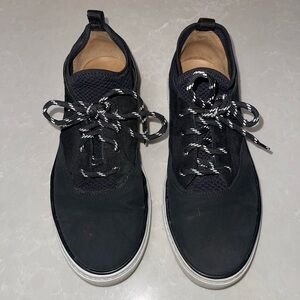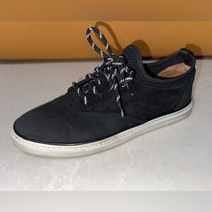 These sneakers feature a sleek black upper paired with a contrasting white rubber sole, offering a classic and versatile look. The minimalist design and lightweight construction make them perfect for everyday wear, ensuring comfort and style with every step.