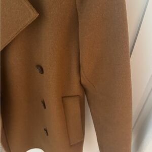 Elegant tan pea coat with a double-breasted design. Ideal for a sophisticated look.
