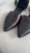 Sleek black leather flats with a stylish ankle strap. Perfect for versatile wear. Mild iridescent oil slick finish. Very one of a kind for this brand.