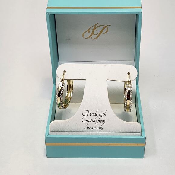 Jenni Park Swarovski clear crystal and gold tone metal round hoop 1" earrings, hinge bar closure. Signed Fashion Jewelry Everyday Workwear Career Party Bling Lightweight