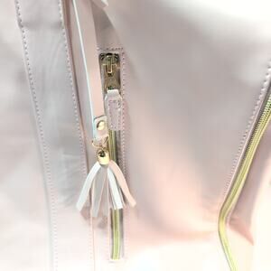 This JenniBag weekend travel bag in a beautiful blush pink offers both sophisticated style and practical function for your next getaway. The smooth, blush-toned faux leather gives a luxurious, soft-touch feel, accented by bright gold-tone hardware—including durable zippers and stylish snaps—for a polished, feminine look.