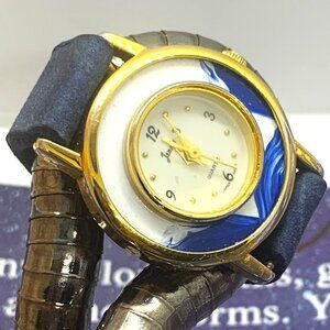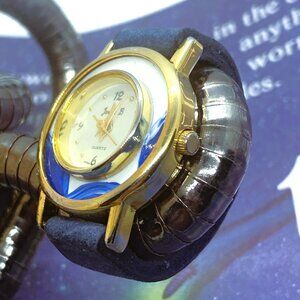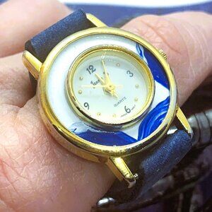 Jennie B Gold/White & Blue Enamel Custom Blue Leather Band Watch Ring Sz 10 US