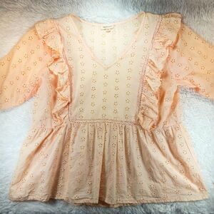 Jennifer + Grace Eyelet Ruffle Peplum Style Blouse Women's L. Peach Colored. Vneck.