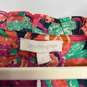 Embrace vibrant style with this Jennifer Grace floral ruffle sleeve top, perfect for adding a pop of color to your wardrobe. The top features a beautiful mix of pink, green, and orange floral patterns against a dark background. The ruffled sleeves and delicate pleating around the neckline add a touch of femininity and charm.
