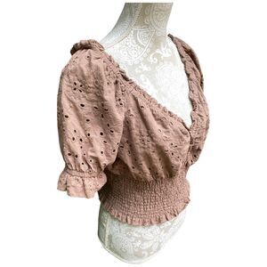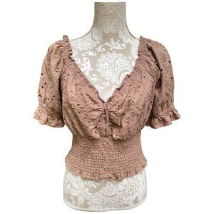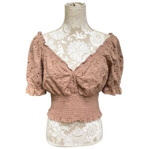 Jennifer & Grace Womens Brown Eyelet Cropped Smocked Blouse Puff Sleeve NWT