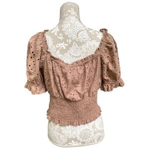 Jennifer & Grace Women’s Brown Eyelet Smocked Milkmaid Blouse Puff Sleeve NWT