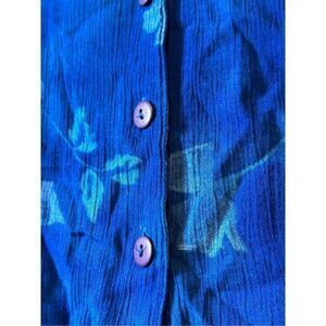Evoke sun-drenched tranquility with this vibrant blouse, a statement piece that promises effortless style. Delicate floral patterns dance across the rich blue rayon, creating a captivating visual texture. The classic button-down design adds a touch of timeless sophistication, making it a versatile addition to any wardrobe. Perfect for a casual brunch with friends, a relaxed afternoon exploring local shops, or adding a pop of color to your work-from-home ensemble.