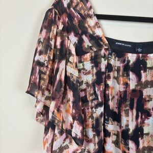 Jennifer Lloyd Black/Cream/Orange/Yellow Patterned Square Neckline Blouse with Sheer Flowy Short Sleeves and Ruffled Hemline; Lined; Gathered Shoulder Seam; Size XL; When lying flat, measures 20" pit to pit, 23" in length from center neckline to bottom hem, and 28" from top shoulder seam to bottom hem; Fabric and Care instructions shown in pictures