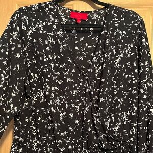 Super cute peplum style top with an elastic waist and wrap style opening. Very flattering for the office or dress it up for a more formal occasion!