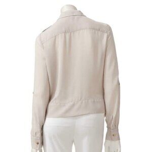 Featuring lightweight chiffon construction, front tie detailing, shoulder epaulets, button tab long sleeves and asymmetrical zip front. Unlined. Polyester.