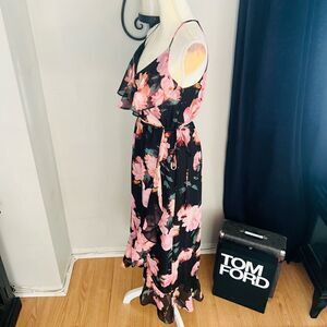 Jennifer Lopez Faux Wrap Ruffle Maxi Dress, Black/Pink, Size 2, Summer Wedding