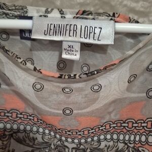 This relaxed blouse by Jennifer Lopez features a captivating graphic design in gray and pink hues. The 3/4 sleeves add a touch of elegance, making it a versatile addition to any wardrobe. Its artistic style ensures a comfortable yet chic look for any casual occasion.