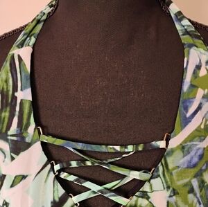 Chic backless dress with a vibrant leaf pattern. Features a halter neckline. Perfect for summer outings.