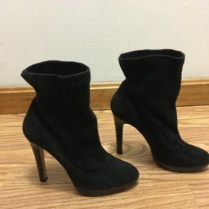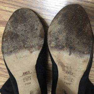 Black suede J.Lo ankle boots! Approx. 3/4" platform with 4" heel. The base of these boots are just like regular pumps, but the upper ankle part is soft/floppy microsuede fabric - it is not rigid. The soles are well worn but the rest of the shoes still look great.