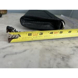This is a Jennifer Lopez black wristlet clutch purse designed for parties, weddings, and cocktail events. It features a solid pattern with a rectangular shape, a zip closure, and a chain strap with black handles. The exterior is made of faux leather with silver hardware, and the interior lining is also black. The wristlet has a width of 10.5 inches, a height of 5.5 inches, and a depth of 1.5 inches.