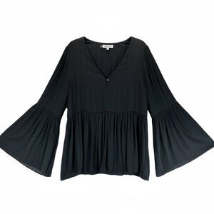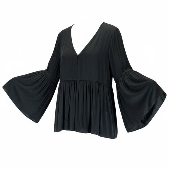 Soft, flowy Jennifer Lopez by JLO black blouse featuring a flattering V-neckline, airy peplum hem, and dramatic bell sleeves. Lightweight and comfortable with beautiful drape — easy to dress up or down. A timeless piece with modern boho vibes that works year-round.