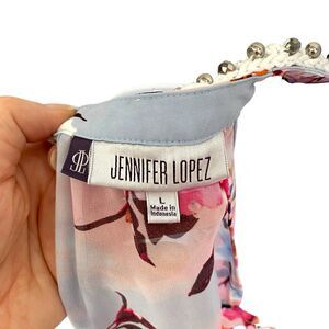 Get ready to turn heads with this stunning Jennifer Lopez JLo Misses Embellished Keyhole Split Back Floral Tank Top L. The multicolor floral pattern and halter neckline make it a perfect choice for any occasion. This tunic-style tank top is made for women and comes in a regular size L.