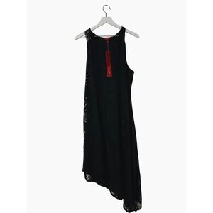 This Jennifer Lopez dress features an asymmetrical hemline and a delicate burnout overlay with lining underneath for coverage. The sleek jersey construction keeps it lightweight and figure-flattering. Wear it for evening events, cocktail nights, or dressy occasions. The minimalist black palette complements a wide range of accessories and shoes.
