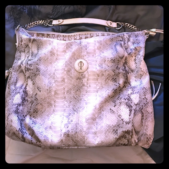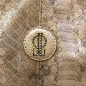 This is a JLo snake print bag. Hardly used. In great condition. Has a divider inside to creat two big open sides and has a zip in the middle to crest a third pocket. It has two zipper pockets on the side. Comfortable and stylish!
