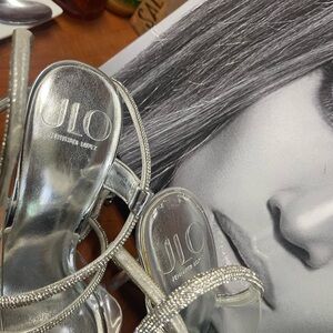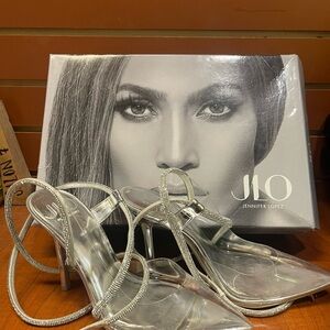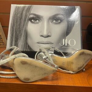 Elevate your evening ensemble with these glamorous silver stiletto heels from Jennifer Lopez. Featuring a sophisticated strappy design, these heels are perfect for special occasions. The metallic finish adds a touch of elegance and sophistication to any outfit.