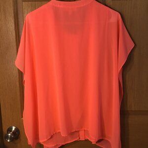 Jennifer Lopez Flourescent orange summer blouse, front has gold buttons scoop neck, Large front also has ruffles, sleeveless shear like material