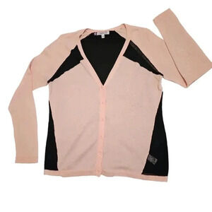 Cute V-Neck Button Down Sweater, Back is Sheer, Front Panel & Sleeves 100% Cotton Insert & Back Panel 83% Cotton 17% Nylon, Armpit to Armpit 20in Sleeve Length 28in Length 27in