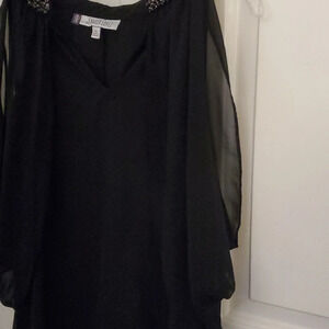 Pre Loved Great condition- Black blouse with jeweled collar, short front, long back. Very lightweight and sheer.