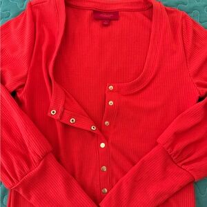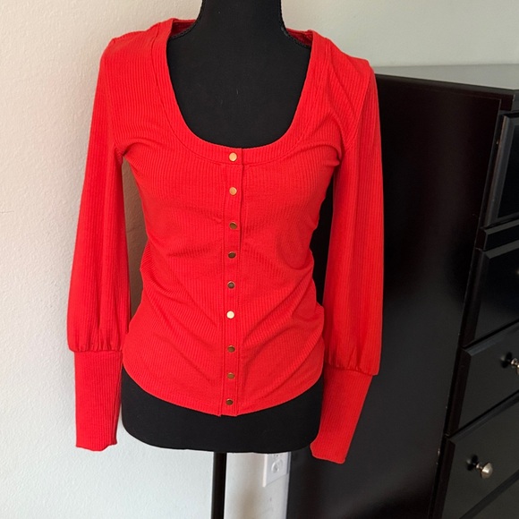 Chic red button-down with gold buttons. Long sleeves and ribbed texture. Ideal for stylish outings.