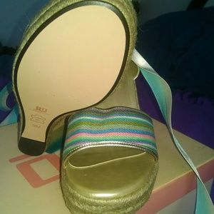 Jennifer Lopez 3 1\2 inch wedges with gold bottom and blue\white satin tie up ribbon. Excellent condition with box, only wore once.