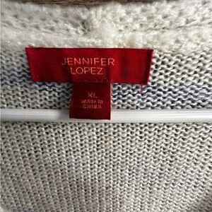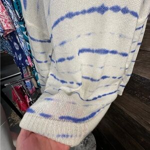 This Jennifer Lopez V-neck sweater showcases a relaxed, loose-knit design with organic blue stripes on a white base, offering a casual and artistic vibe. Its lightweight fabric and slightly oversized fit make it ideal for everyday wear.