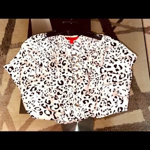 Rose/Blk leopard print blouse by Jennifer Lopez had a 3 gold ring accent design in the front. Long sleeve with gold button closure. 100% polyester. Size XXL. Sleeve measures 28 inches in length; pit-to-pit measures 28 inches