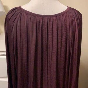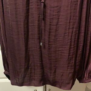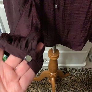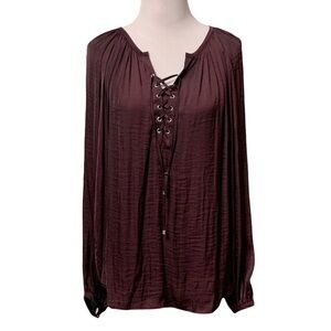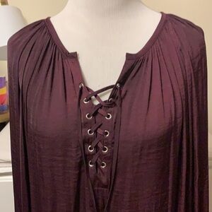 This is a Jennifer Lopez plum colored silky polyester top that features long sleeves with a button at the wrist and a laced up front. This has never been worn, super cute style, oversized fit so it shows lots of movement when you wear it. See photos for measurements, new without tags, never worn. Size small