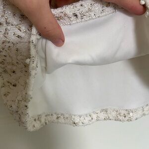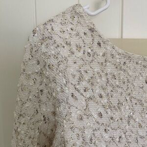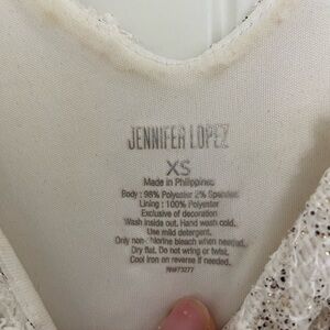 Women’s Jennifer Lopez top. Top is white with silver sequins & beautiful lace pattern. Has strap of fabric across the neckline in the back. In good condition, but has some slight discoloring inside the shirt—only inside, so won’t be noticeable when wearing! Size XS. Smoke free home!