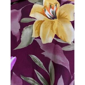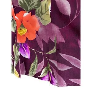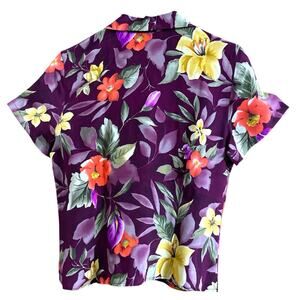 Beautiful vintage Jennifer Moore Petites blouse, vibrant purple color with red & yellow flowers. Made from 100% silk, it feels luxurious against the skin and drapes beautifully. Short sleeve collared pearlized buttons the front make it suitable for both casual and more dressed-up occasions.