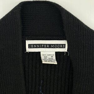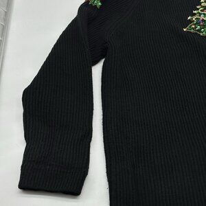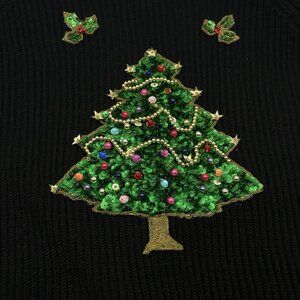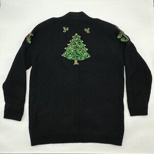 This listing is for a pre-owned Jennifer Moore vintage Christmas black knit cardigan sweater in a size medium. This sweater is in good used condition with no stains or rips, and features inner shoulder pads, front pockets, and various Christmas sequin/beaded appliqués throughout front and sleeves with Christmas tree on back. This shirt was made in Indonesia and is made of 100% acrylic. Measurements are: front top of collar to bottom vertically is 33“, back top of collar to bottom vertically is 32.5“, top of collar to end of sleeve is 32.5“, chest (pit to pit) is 50“, and waist (bottom hem horizontally) is 42“. Please see all listing photos, as this listing is for sale in as/is pre-owned condition.