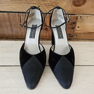 Jennifer Moore black satin and crushed velvet strappy heels. Slightly pointed toe. Thicker heel. Size 6. 3-1/4" heel, 7/8" wide heel. Heel to toe 10". Exterior in excellent condition, just one small mark on the heel. Minor wear to soles. Some cracking on the interior. STRAPS AT BUCKLES MUST BE REPLACED. Please see photos for imperfections/condition.