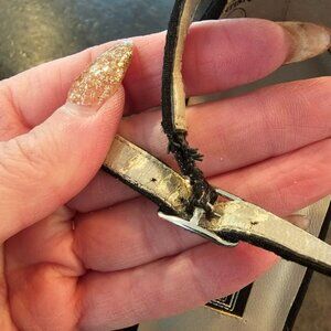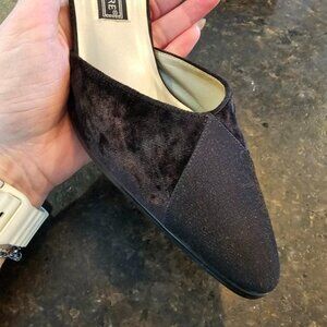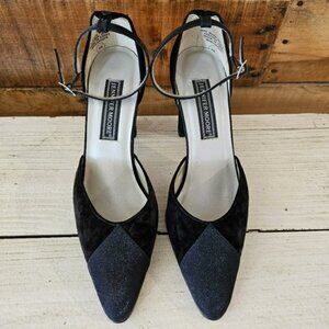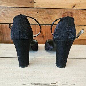 Jennifer Moore black satin and crushed velvet strappy heels. Slightly pointed toe. Thicker heel. Size 6. 3-1/4" heel, 7/8" wide heel. Heel to toe 10". Exterior in excellent condition, just one small mark on the heel. Minor wear to soles. Some cracking on the interior. STRAPS AT BUCKLES MUST BE REPLACED. Please see photos for imperfections/condition.