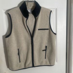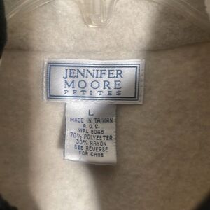 Large/Petite, light greyish color trimmed in black, front zip up, 2 zip pockets on front each side, 70% polyester and 30% rayon, pre-owned excellent condition.
