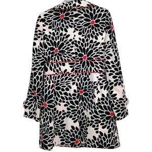 Make a bold statement with this stunning Jennifer Reale Design floral jacket. Featuring a retro mod-inspired print in striking black and red with vivid floral patterns, this tailored statement piece combines sophistication with artistic flair. The red rickrack trim and matching red buttons add a playful vintage touch, while the structured silhouette ensures a flattering fit.