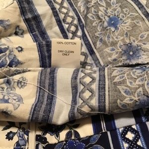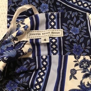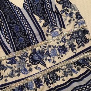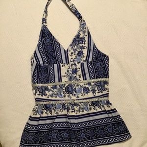 Super cute Jennifer Reale blue and white Halter Top with fitted waist and peplum. Sequins detail takes it from casual to a night out. Zipper back. Size 4. 100% cotton